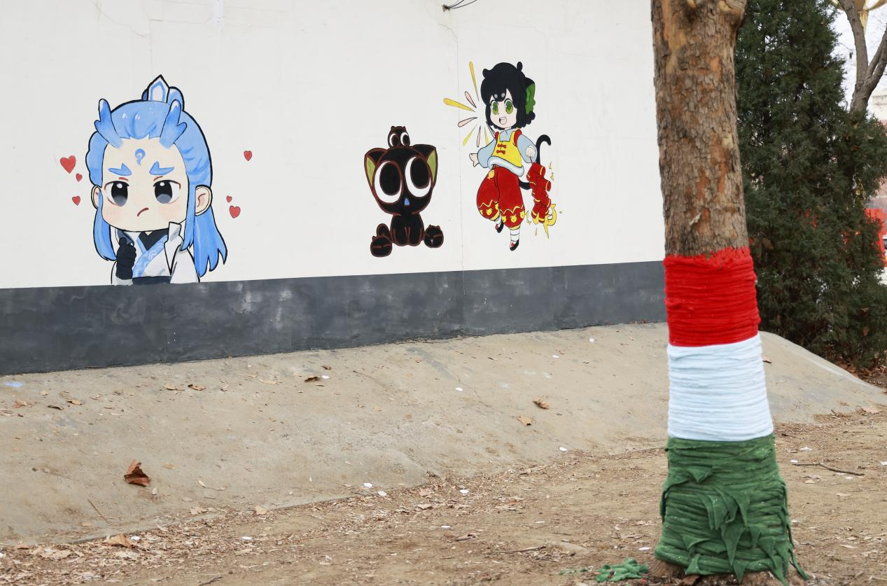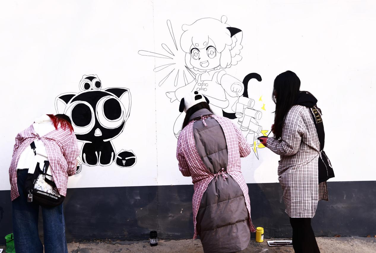 神通广大的哪吒、温润如玉的敖丙、软萌可爱的罗小黑,1月17日,在河北省保定市高阳县人民公园内,县职教中心现代纺织产业学院的30余名学生化身“画家”,手持画笔在墙壁上绘制出一个个色彩斑斓、憨态可掬的卡通形象,为公园增色添彩。