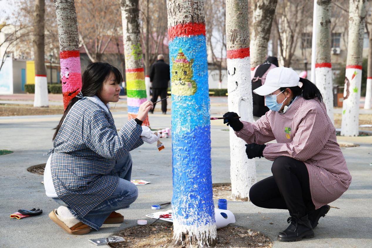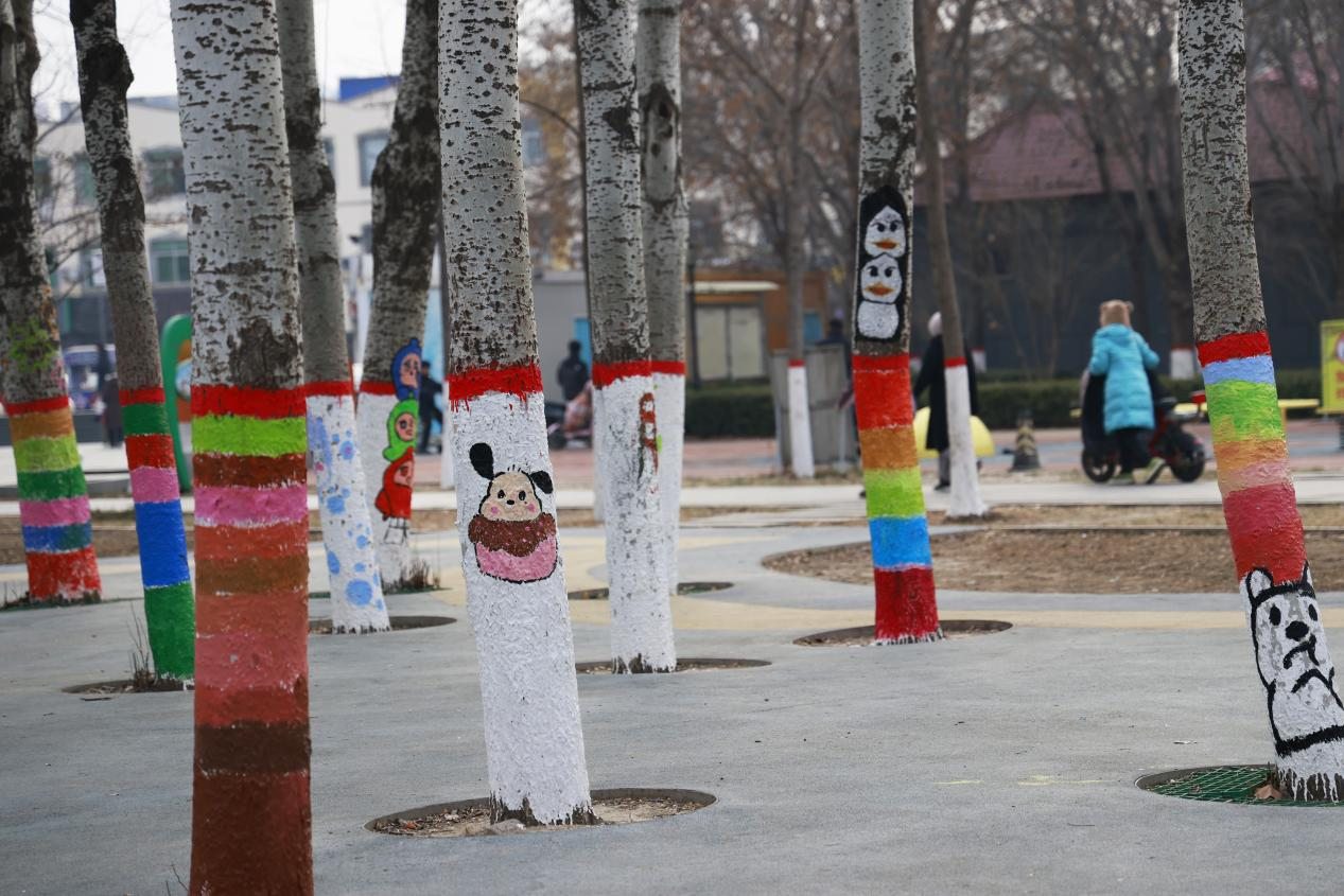 活动现场,学生们不仅绘制了墙体画,还在一些树干上绘制出一个个经典卡通造型,并巧妙利用树洞空间绘制各种萌趣小动物,让原本单调的树木变成生动的“自然艺术作品”。公园工作人员将珊瑚绒布条巧妙缠绕在树根,为园区树木穿上了色彩斑斓的“彩虹毛衣”,红、黄、蓝、绿等鲜明色彩交错缠绕,为树木抵御冬日寒风的同时也变成一道道靓丽的风景线。