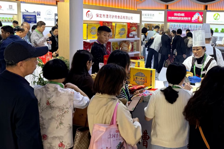 开幕第一天,一位法国女士参观徐水漕河驴肉食品有限公司展位,品尝现做现切的驴肉火烧后,用生疏的汉语问:“哪儿做的?”“河北保定。”公司采购部经理柏金龙笑着介绍驴火制作过程、历史传承、古老工艺。双方商定,就礼盒驴肉销售进行合作。