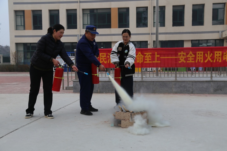 学校老师在消防员指导下使用灭火器灭火 摄影 张旭宁