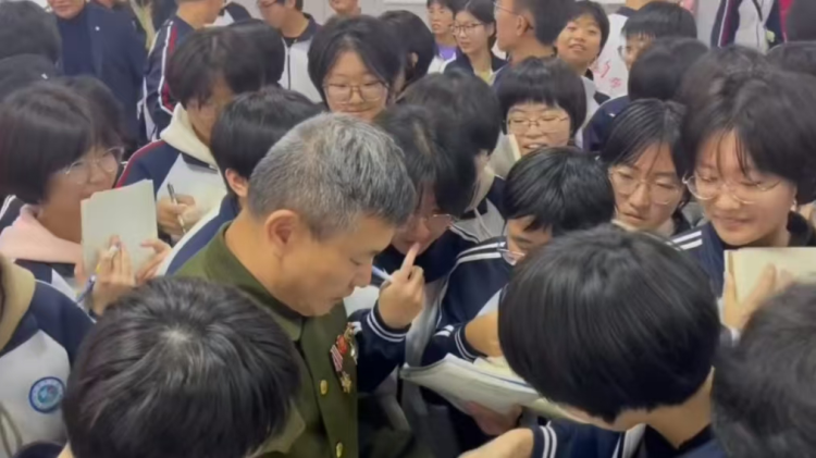 学生们围到英雄楷模身边请求签名留念 摄影 马兵祥
