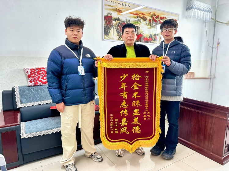 11月17日清晨,河北外国语学院国际航空旅游学院办公室内暖意融融。市民胡先生携同家人专程赶来,将一封字迹工整的感谢信和一面印着“拾金不昧品德高 立德树人育英才”的锦旗,郑重送到学院负责人手中,再三恳请将这份敬意转交2024级铁道交通运营管理专业的李晨鑫、车德义两名同学。这温情一幕的背后,是两名学子用拾金不昧、婉拒酬金的实际行动,交出了当代大学生诚信答卷。