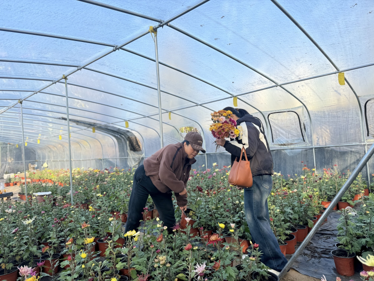 游客正在挑选菊花