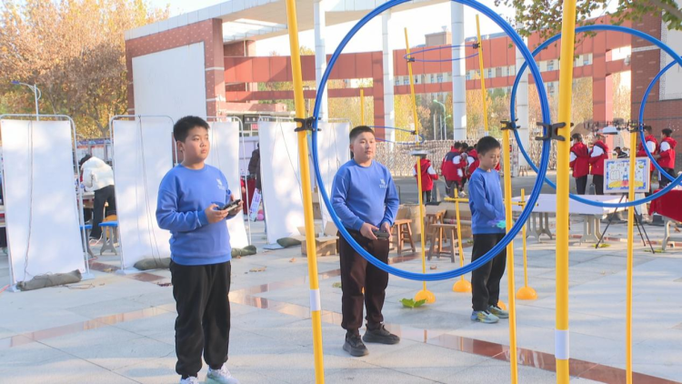 小毕村小学学生韩鸣晰说:“我们刚才展示的是无人机障碍穿越,需要在2分钟之内完成,这对我们的挑战很大。我们学校每个星期都会开展无人机课程,我已经练了好几个月,我特别喜欢操控无人机。”