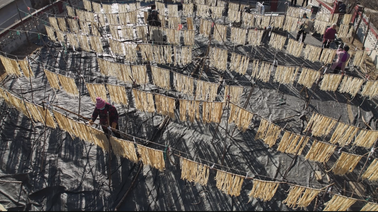 初冬的河北阜平北果园,太行山脉层林尽染,山坳间的晾晒场上,一排排银白的红薯粉条随风轻舞,交织成一幅丰收的图景。