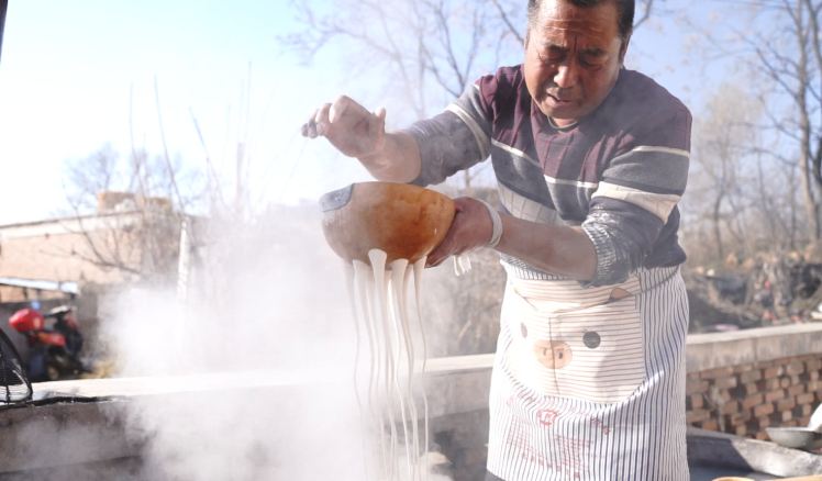 在王道荣的搭伙小组里,李庆春是公认的“老把式”。从生产队时期学手艺,到如今坚守40余年,李庆春一边演示手工漏粉的技艺,一边给人们介绍:“手工制作粉条打芡是个技术活,关键时候差一捧粉面都漏不成。漏粉更得讲究,手腕力道要匀,粉条才能粗细一致;加粉多少、水温高低,全凭经验,差一点口感就变了。”