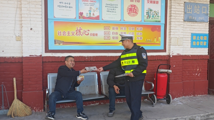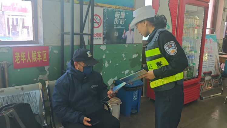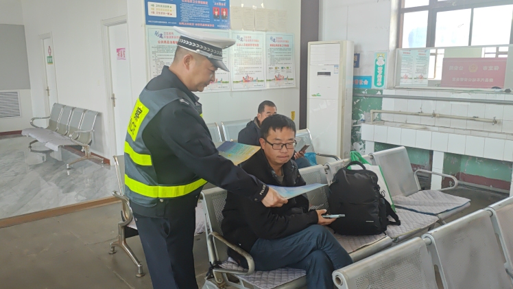 工作人员在候车区发放宣传页 唐县交警大队供图
