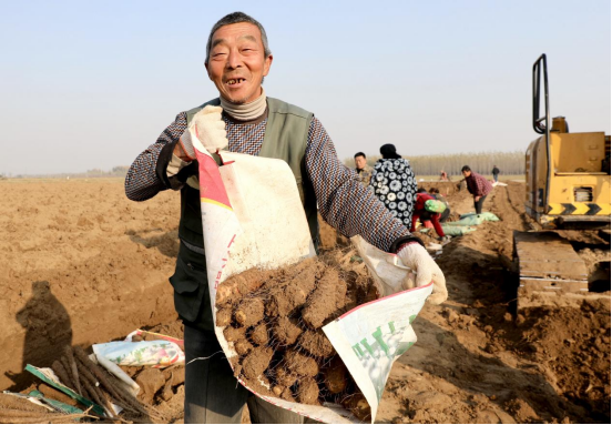 近日,在河北省沧州市肃宁县尚村镇一家麻山药专业合作社种植基地,挖掘机正在开沟挖地垄,农户们忙着采挖、去土、挑选、搬运麻山药。