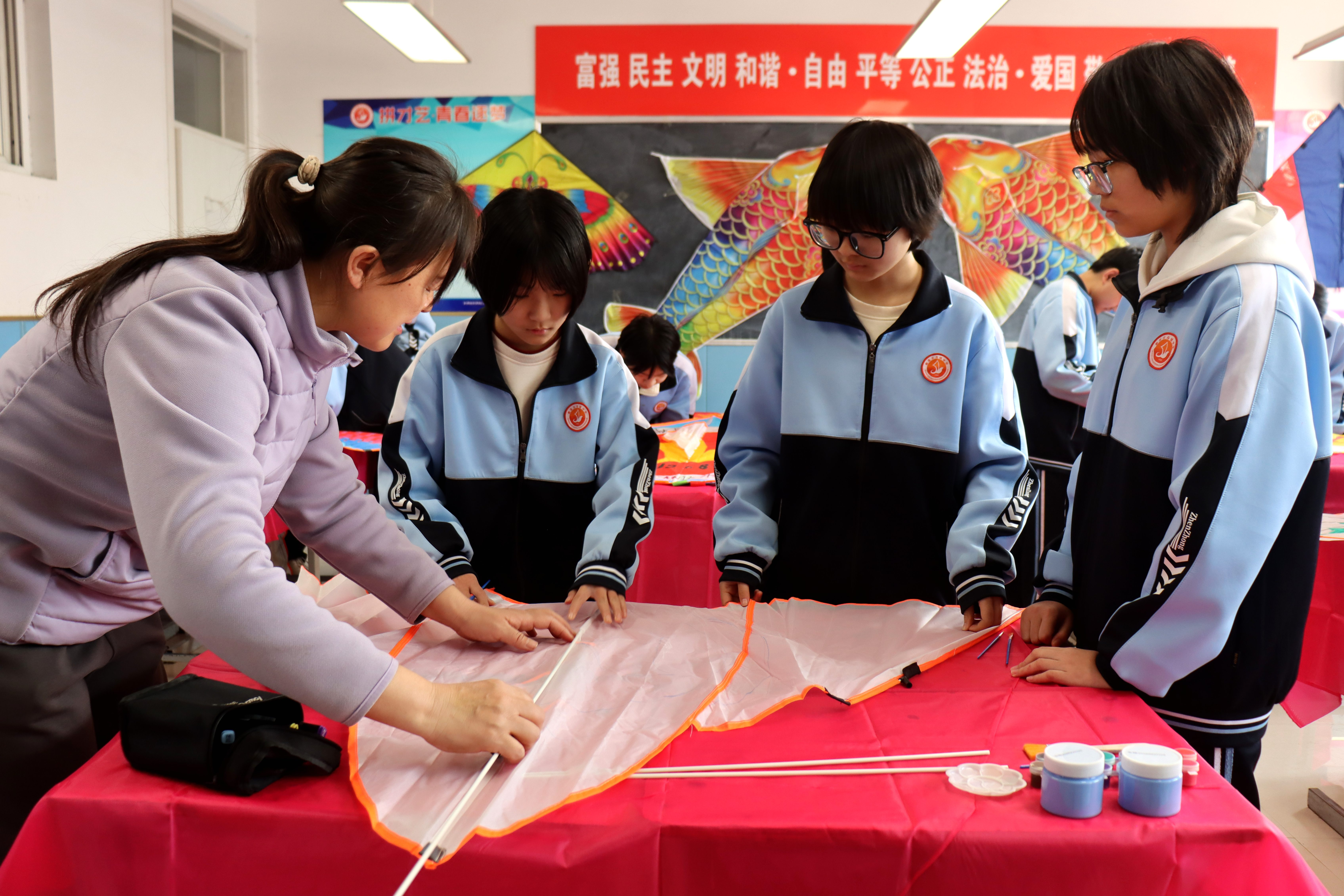 老师在教学生组装风筝 摄影 李谦