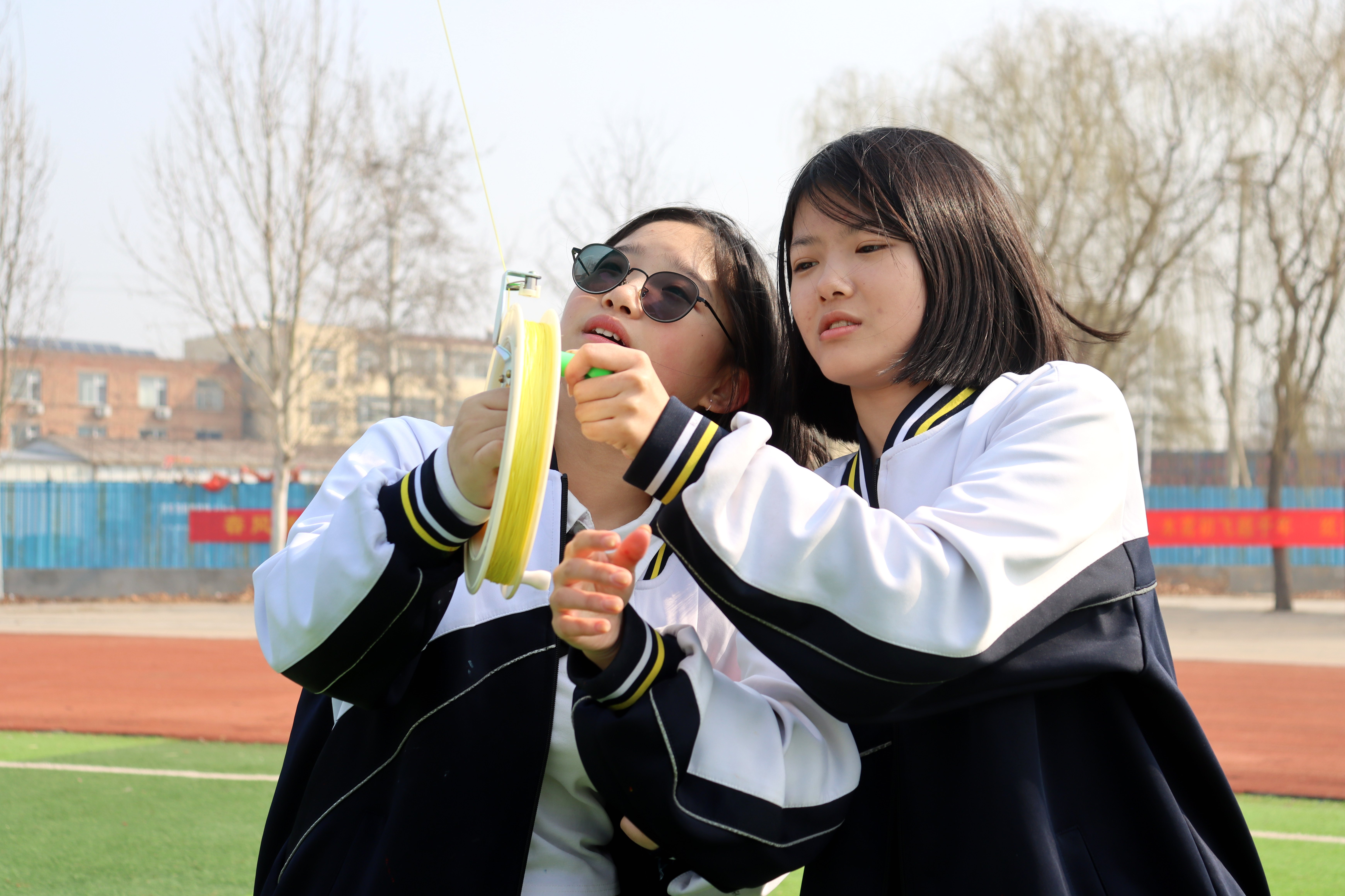 绿茵场上,学生们紧握线轴,迎风奔跑,彼此配合默契。拉线、放线、奔跑、调整……一只只纸鸢挣脱地面的束缚,扶摇直上,在蔚蓝的天空中舒展翱翔。各班同学有序参与、通力协作,让承载着心愿的风筝飞向高空,寄寓着“梦想高飞、中考得胜”的美好期许。高低错落的纸鸢与湛蓝晴空相映成趣,校园里欢呼声、加油声、笑声此起彼伏,青春的活力和朝气洋溢在校园里的每一个角落。