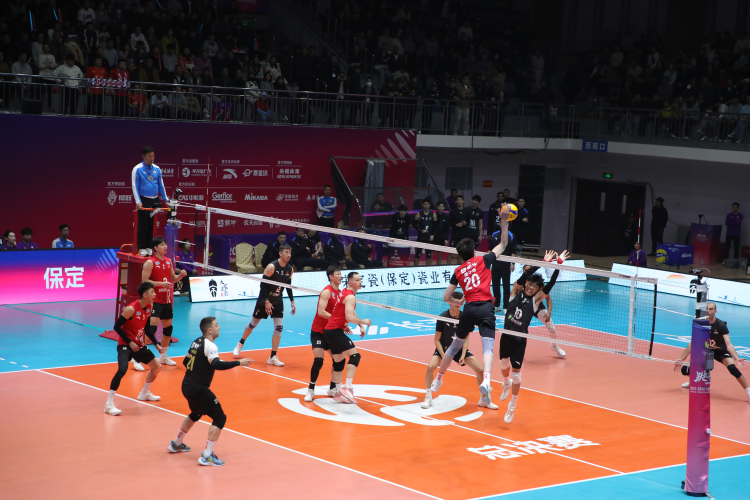 4月2日晚,保定市徐水区兴芮体育馆内座无虚席,2025-2026中国男排超级联赛第二场总决赛展开激烈争夺,保定沃隶队主场对阵天津食品集团队。