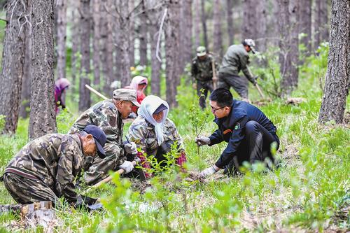 2024年5月23日,塞罕坝机械林场技术员唐超(前排右一)在指导附近村民栽植树苗。(本报资料片)本报记者 田明摄